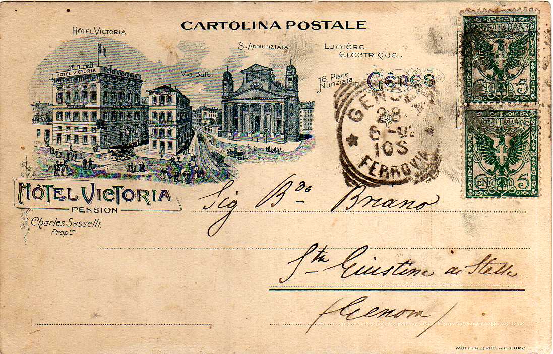Cartolina vg. in data 28 giugno 1902, affrancata con due valori da cent.5 destinazione Genova.