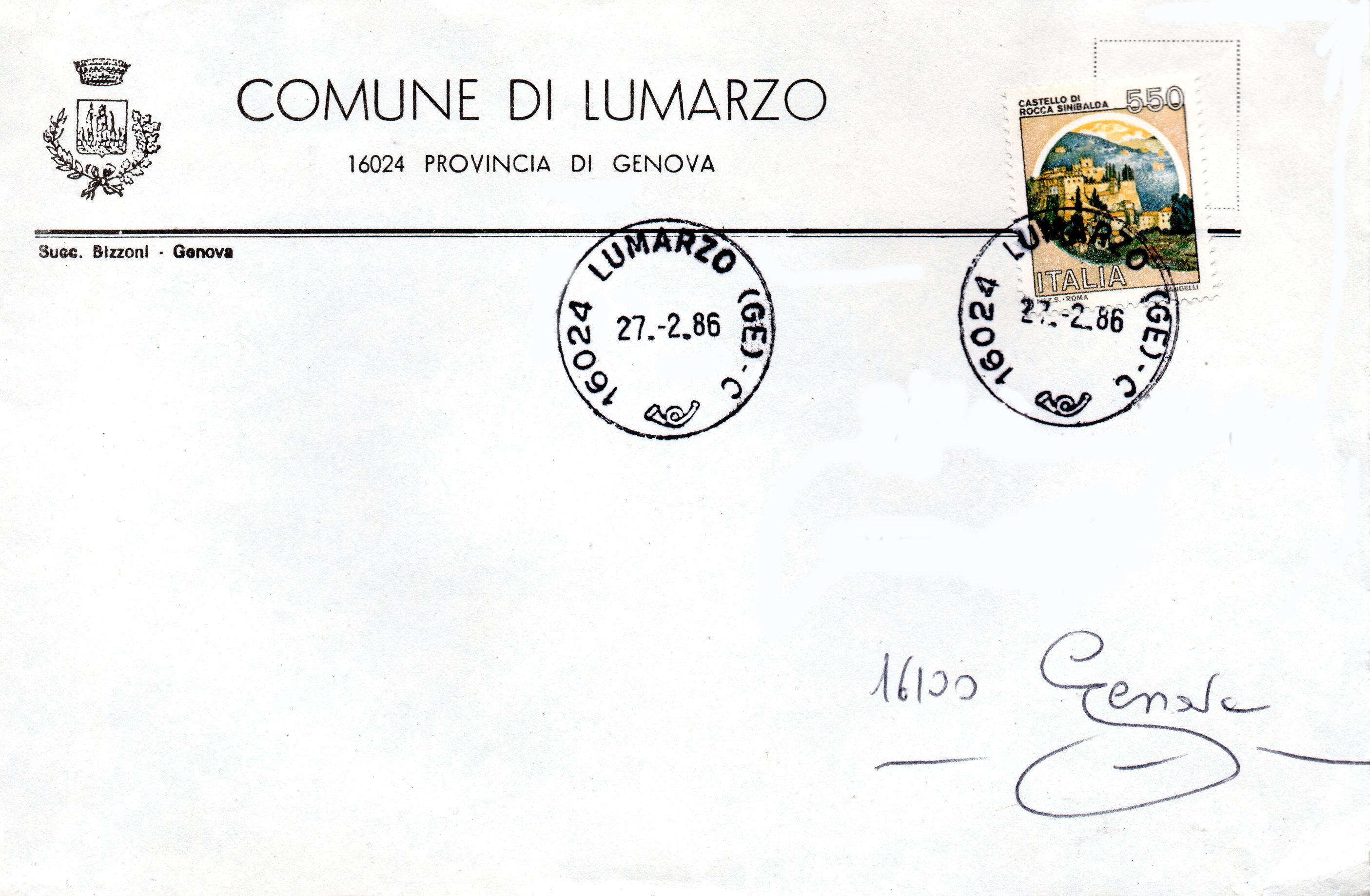 Busta pubblicitaria del Comune di Lumarzo, spedita in data 27 marzo 1986, affrancata con un valore da Lire 550