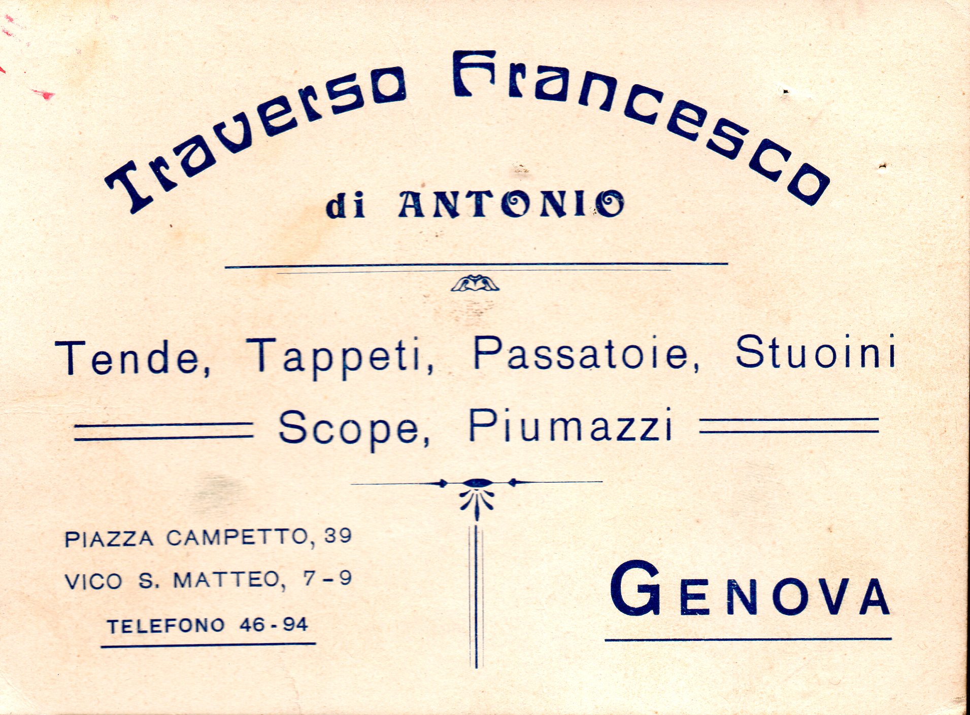 TRAVERSO FRANCESCO di Antonio Vendita di Tende, Tappeti, Passatoie, Stoini, Scope e Piumazzi. Genova piazza Campetto, 39 Vico S. Matteo, 7-9 Biglietto da visita utilizzato come ricevuta di pagamento per due tende da persiane. La ricevuta porta la data del 25 aprile 1918.