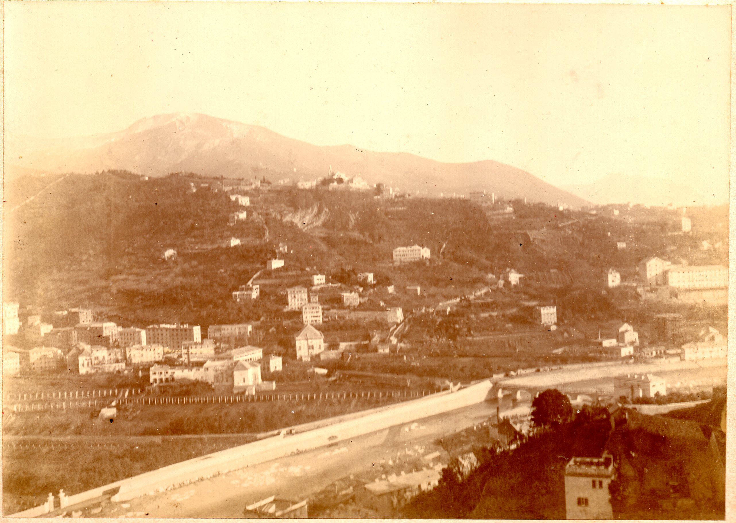 La foto riprende una parte della zona di Marassi, alcuni particolari: il Santuario del Monte, il vecchio ponte che collegava piazza Romagnosi all'attuale piazza Carloforte, il palazzo dove aveva sede il comune di Marassi, la villa delle Suore oggi all'incrocio tra corso Sardegna e via Monticelli nascosta dalla nuova costruzione, villa Bracelli con il grande parco dove è stato costruito lo stadio, il muro di via del Piano appena costruito.