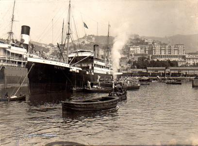 Foto della nave Skutari, ormeggiata nel porto di Genova, durante la fase di carico delle merci, si vedono sotto bordo le chiatte in attesa di essere scaricate.