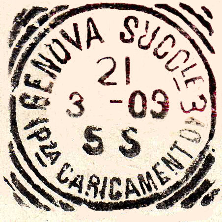 Descrizione del timbro: cerchio semplice, al centro la data con giorno, mese,anno e l'ora, il nome della piazza è inserito tra due parentesi, all'interno due lunette con dodici barrette.