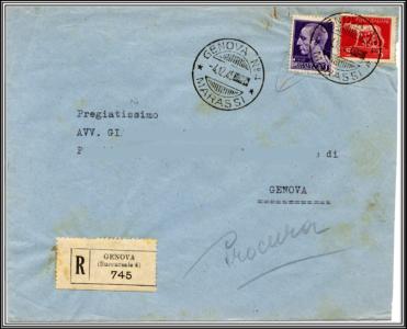 Lettera raccomandata per Genova, affrancata con due valori della serie Imperiale uno da lire 1 con fasci blu e uno da lire 5 carminio senza fasci.