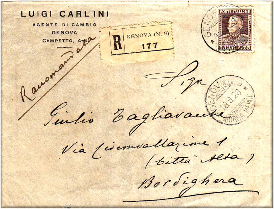 Lettera raccomandata per Genova, affrancata con due valori della serie Imperiale uno da cent.25 verde, e uno da lire 1,25 emessi nel 1929.