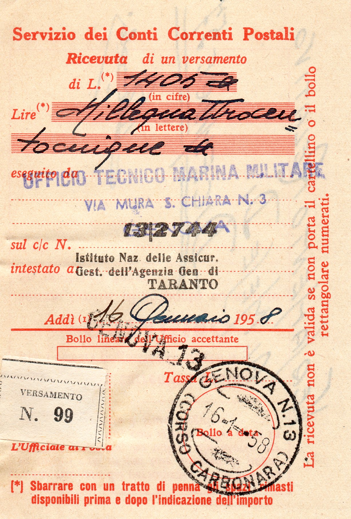 Bollettino di Conto Corrente, utilizzato in data 16 gennaio 1958.