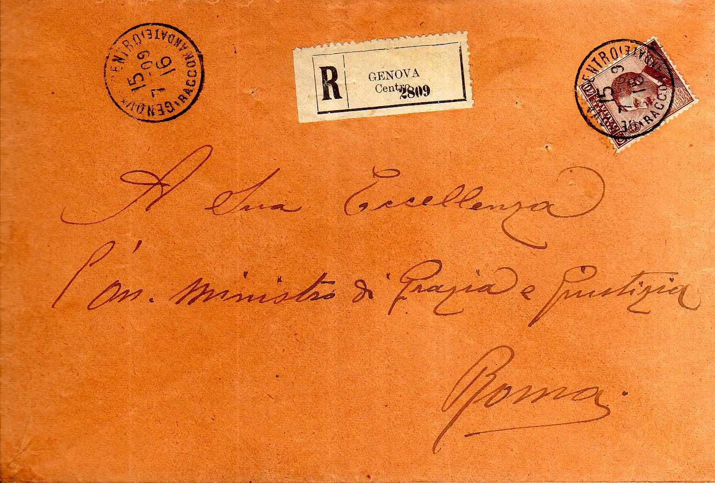 Lettera raccomandata in partenza da Genova per Roma in data 15 luglio 1909, affrancata con cent.40 anullato con il bollo GENOVA CENTRO (RACCOMANDATE) 15 7 09 ore 18