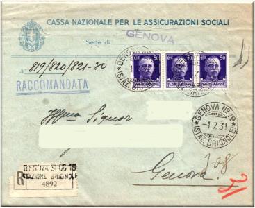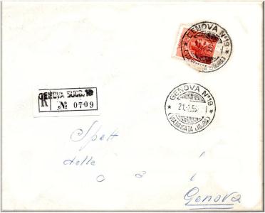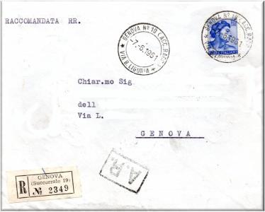 Nell'etichetta della raccomandata è impresso il lineare GENOVA SUCC.19 STAZIONE BRIGNOLE, su due righe.