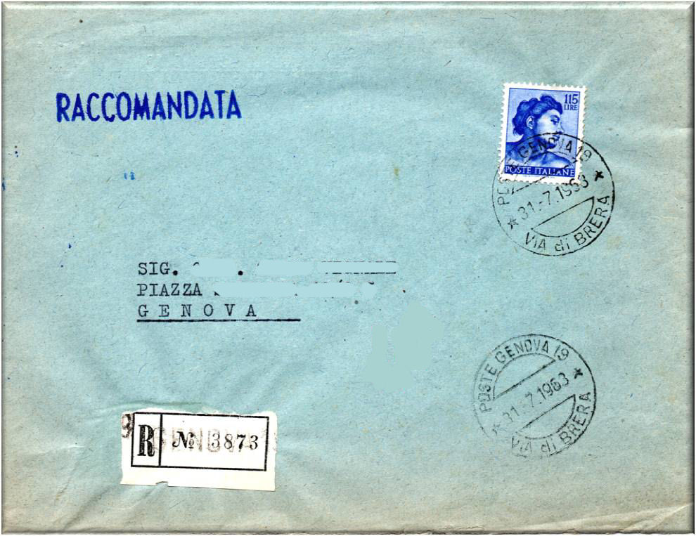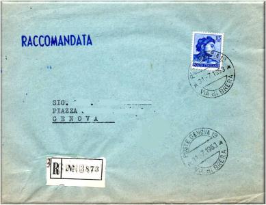 Lettera raccomandata per Genova, affrancata con un valore della serie Michelangiolesca da Lire 115 emesso nel 1961.
