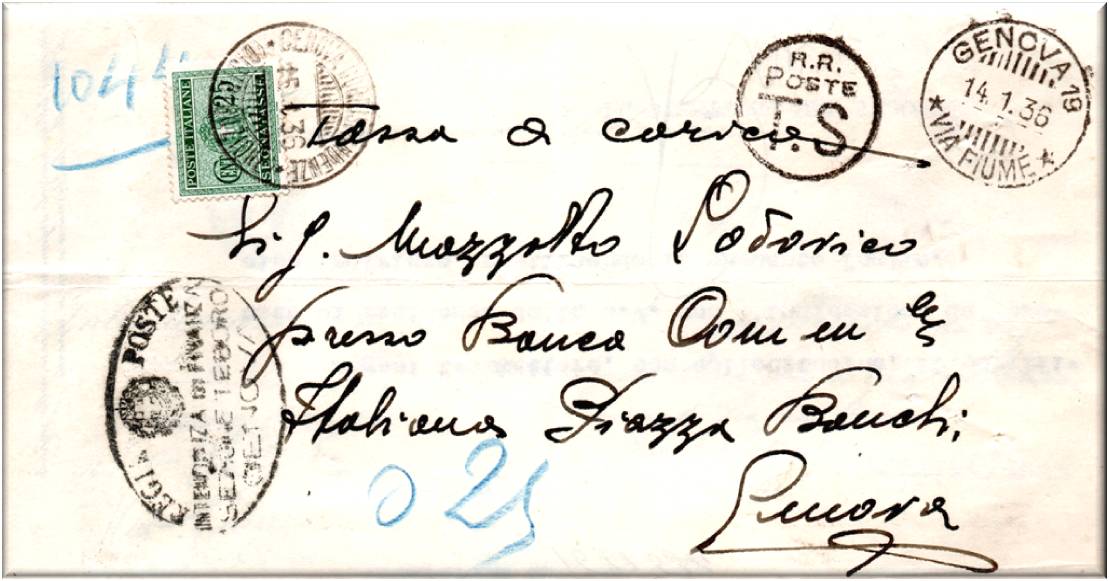 Annullato con il bollo GENOVA n°19 (VIA FIUME) in data 14 gennaio 1936.