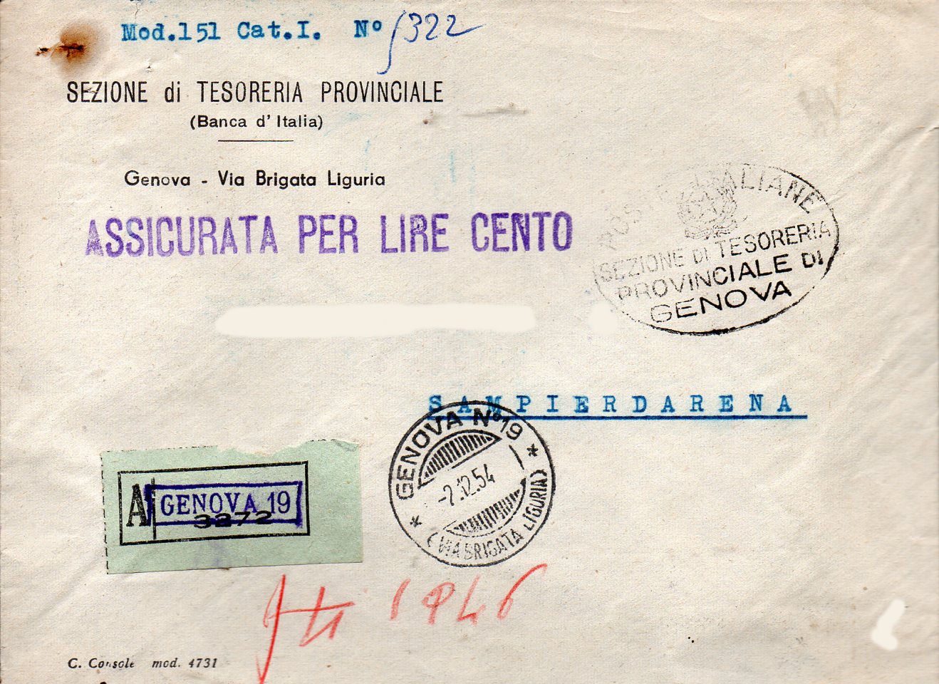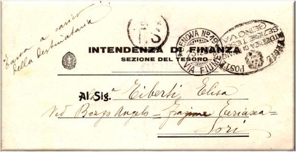 Lettera Assicurata per Genova Sampierdarena, spedita in franchigia postale.