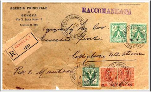 Lettera raccomandata per Castiglione delle Stiviere, affrancata con 5 francobolli per un importo di L.45.