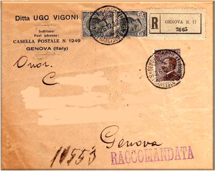 Lettera raccomandata per Genova, affrancata con tre valori due della serie Leoni da 15 cent. più un valore da cent.40 della serie Michetti.
