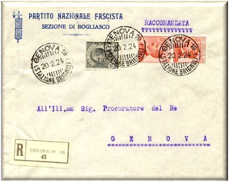 Annullata con il bollo GENOVA n°19 (Stazione Brignoli) in data 20 febbraio 1924.