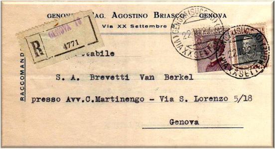 Questa raccomandata è partita da Genova il 27 ottobre 1927, dalla succ. 9 di via Orefici, i fb. vengono annullati con il guller Genova succ.9 (via Orefici).