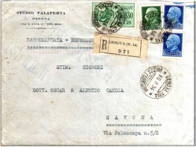 Lettera raccomandata raccomandata-espresso per Savona, affrancata con tre valori della serie Imperiale uno da cent. 25 e due da lire 1,25 più un valore espresso da lire 1,25.