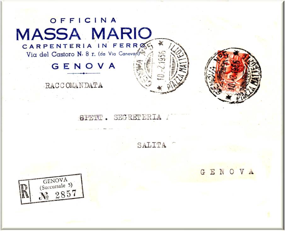 Lettera raccomandata per Genova, affrancata con fb. da lire 80 per il decimo anniversario della Repubblica, emesso il 2 giugno 1956, annullato con il bollo GENOVA N°9 PIAZZA SENAREGA in data 17. 9. 1956