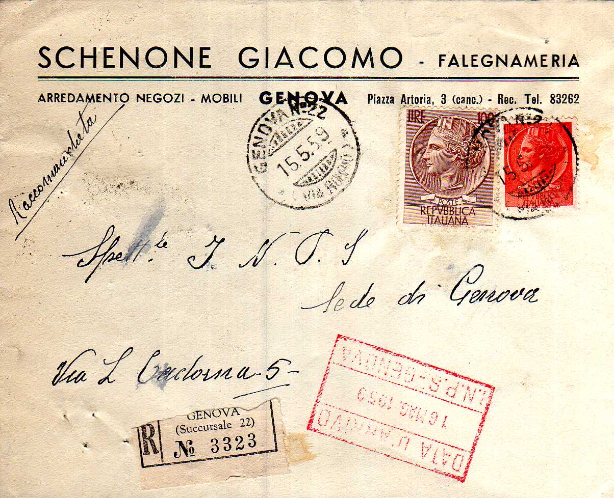 Raccomandata spedita in data 15 maggio 1959 e affrancata con due valori della Siracusana da l.10 e da l.100