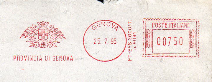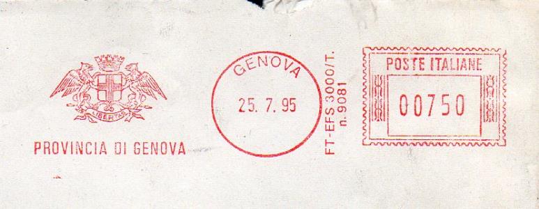 PROVINCIA DI GENOVA In data 25 luglio 1995 Macch. mod.FT-EFS 3000/T. matr. n°9081 In questa affrancature non appare più il cod. di avviamento postale.