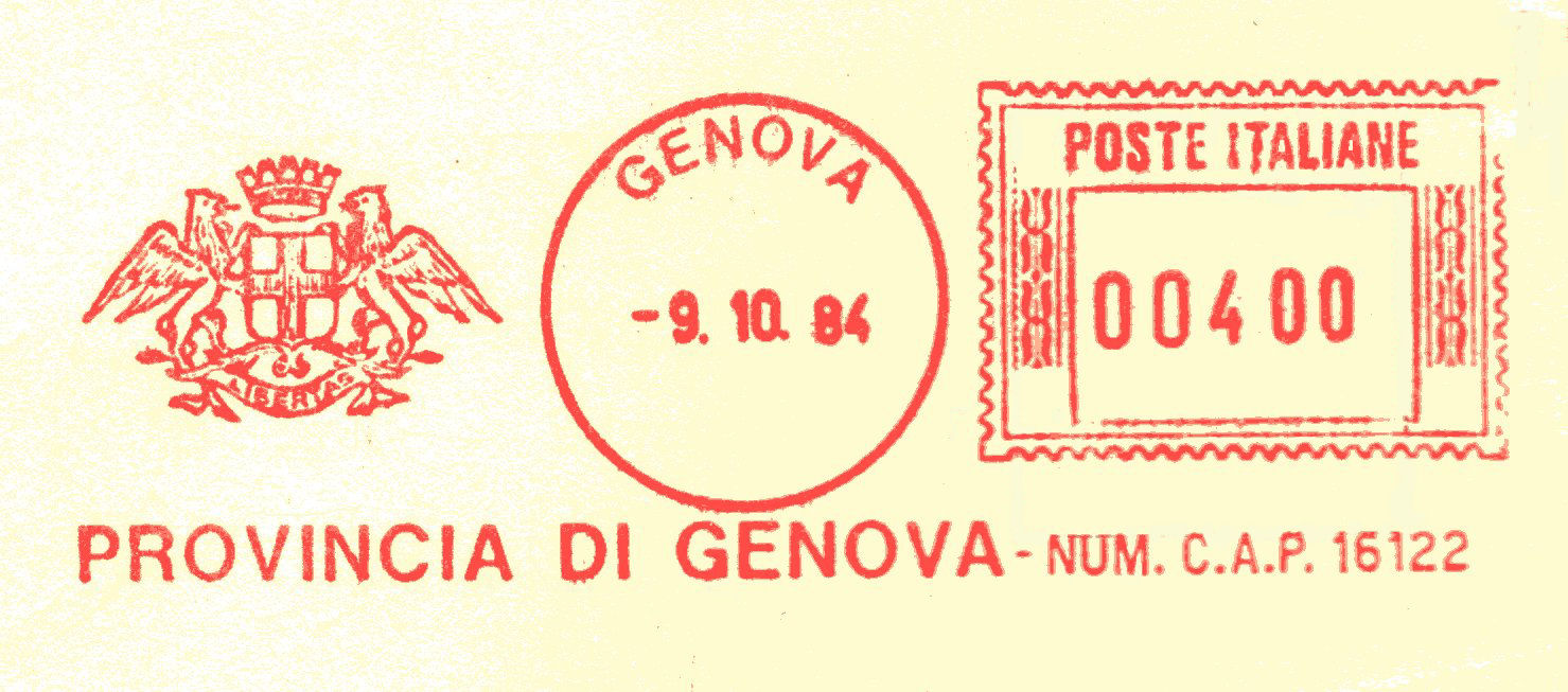 PROVINCIA DI GENOVA In data 25 luglio 1995 Macch. mod.FT-EFS 3000/T. matr. n°9081 In questa affrancature non appare più il cod. di avviamento postale.