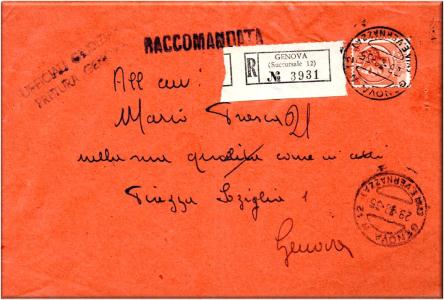 Lettera raccomandata, affrancata con valore da lire 80 annullato con il guller GENOVA 12 VIA ETTORE VERNAZZA., In data 29 agosto 1955.