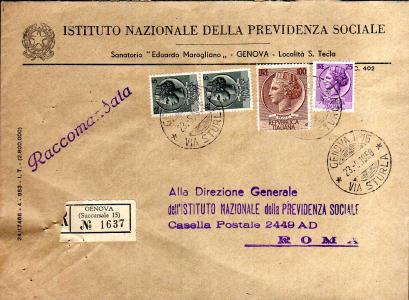 Lettera raccomandata affrancata con 4 valori per un importo di lire 135.