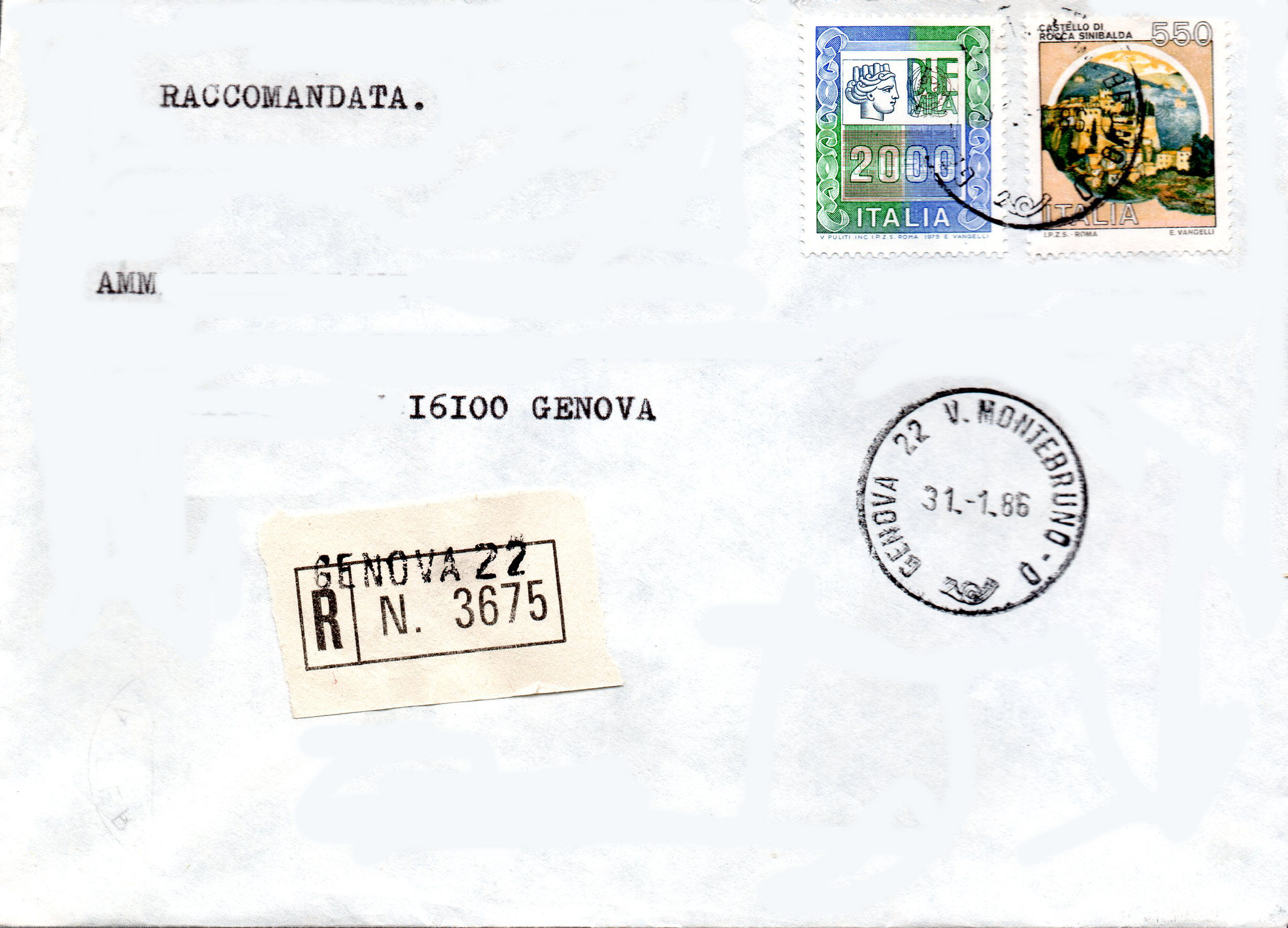 Raccomandata spedita in data 31 gennaio 1986 e affrancata con due valori, uno della serie alti valori da lire 2000 e l'altro della serie castelli da lire 550.