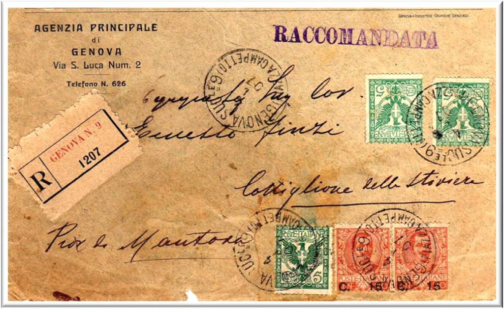 Questa raccomandata è partita da Genova il 27 ottobre 1927, dalla succ. 9 di via Orefici, i fb. vengono annullati con il guller Genova succ.9 (via Orefici).