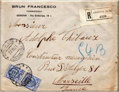 Giunge alla stazione ferroviaria dove riceve il timbro "Genova Ferrovia Raccomandate in data 27-OTT.-1927, ore 24 parte con il treno che la porterà fino a Marsiglia dove giunge il giorno 29 ottobre 1927 e riceve il timbro "Marsiglia Arrivi".